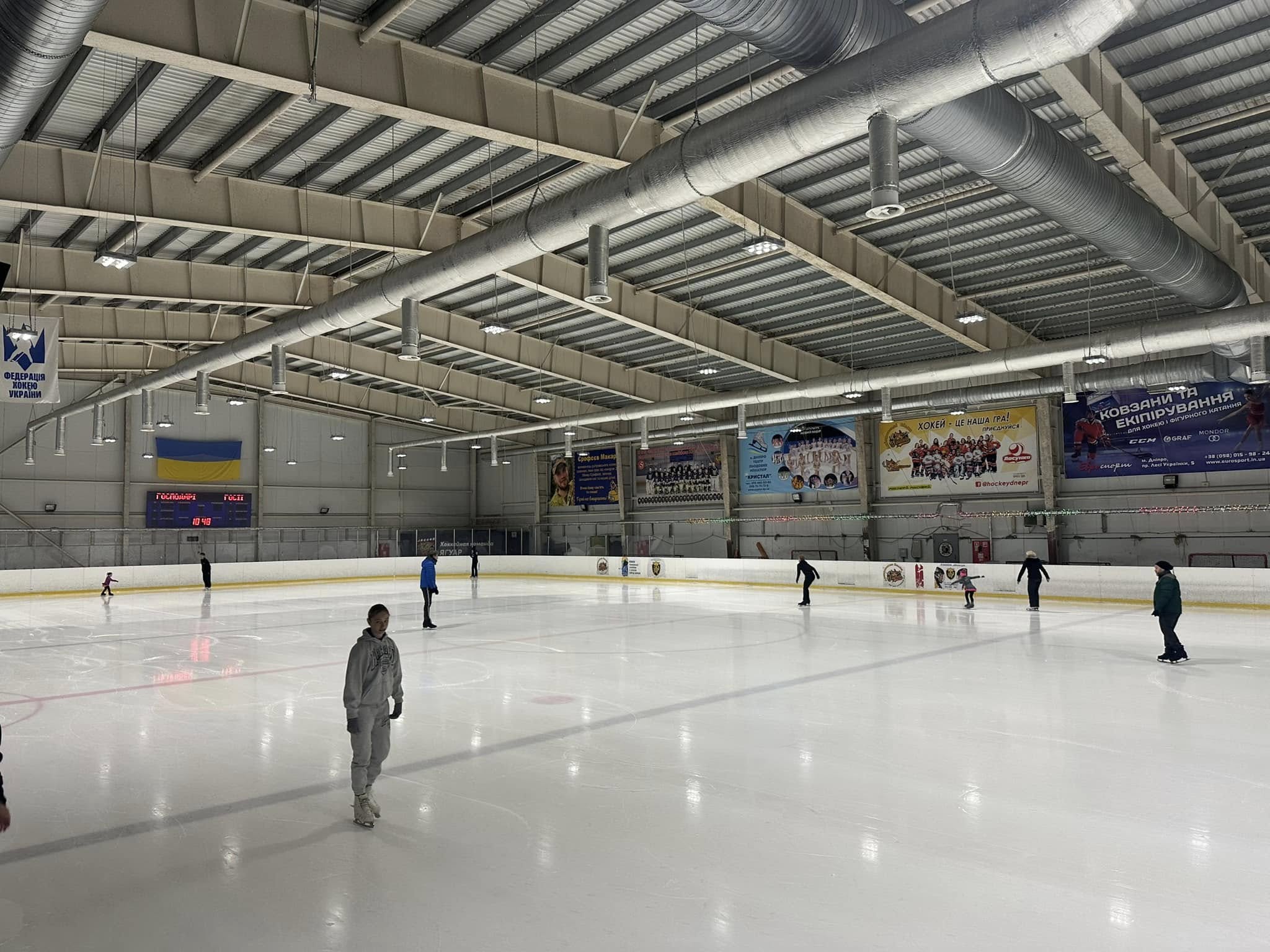 Каток работает в зимний сезон только по выходным — суббота и воскресенье с 15:00. Стоимость катания – 200 грн за 45 минут, прокат коньков под залог 500 грн. Рядом есть кафе, лавки для отдыха и удобная транспортная развязка. Перед визитом советуют уточнять график по телефону +38 (067) 633 81 33, арену могут закрывать на время тренировок.